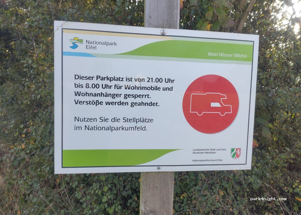 Schöner Platz und ruhig. Wir haben am 22.5.2020 hier übernachtet. 14Tage später kam dann das Ticket mit 35€ Verwarnung. Grund ist das im kompletten Nationalpark Eifel übernachten verboten ist egal in welchem Fahrzeug.