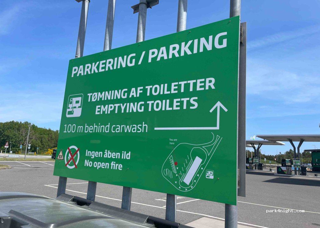 Nous sommes passés par cette station service avant de prendre le ferry. Passage efficace puisque : - Nous avons pu vider nos eaux usées gratuitement. (Possibilité de remplir en eau potable gratuitement aussi.) -Nous avons lavé notre véhicule pour 10DKK la minute. -Et enfin, nous avons pris une douche pour 20DKK. (Il faut entrer dans la station et demander la clef à la caisse.)