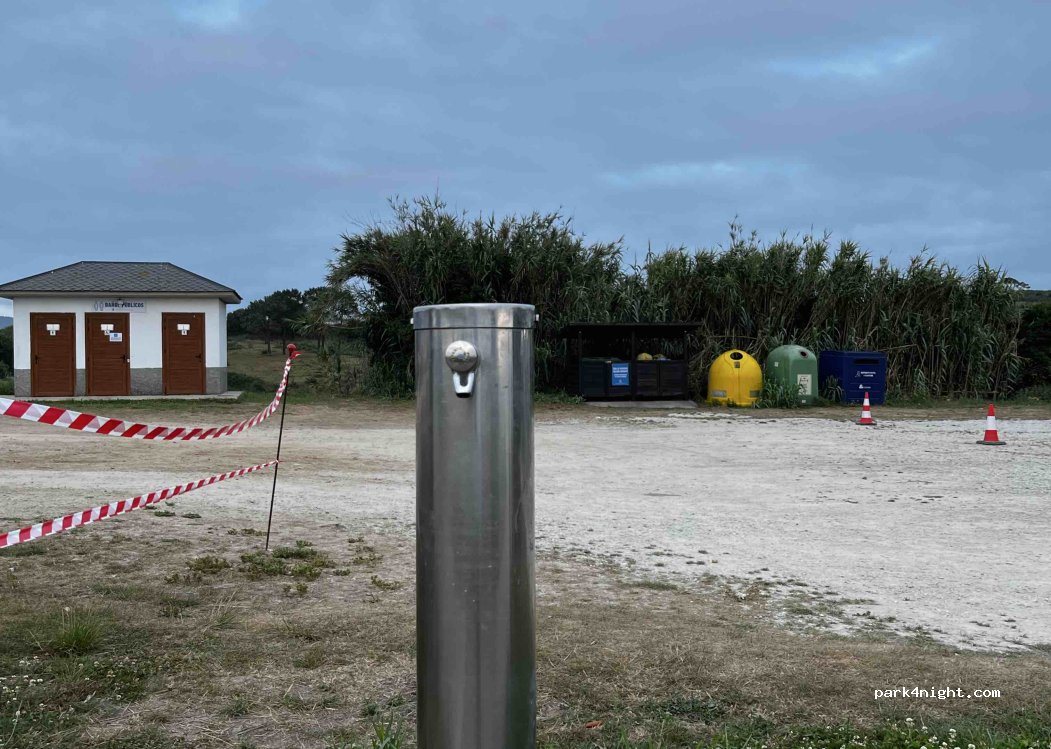 Large free parking near the beach of Serantes. Bar, toilets, showers and beach taps. Do not park in front of wooden cabins as there is a sensor/camera that sets off an alarm for one of the locals.