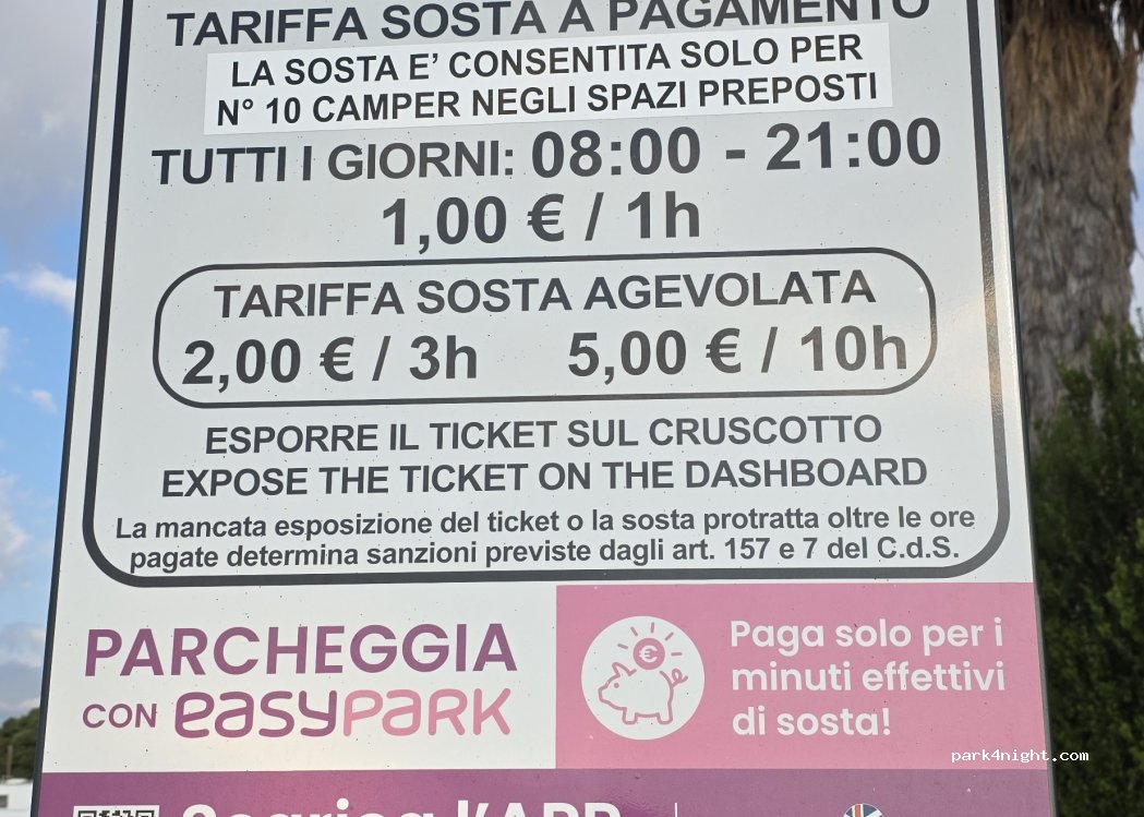 A fine novembre, siamo rimasti per due notti con altri 7 camper. Bellissimo lungomare e centro storico a 2 km. Gratuito in questo periodo.