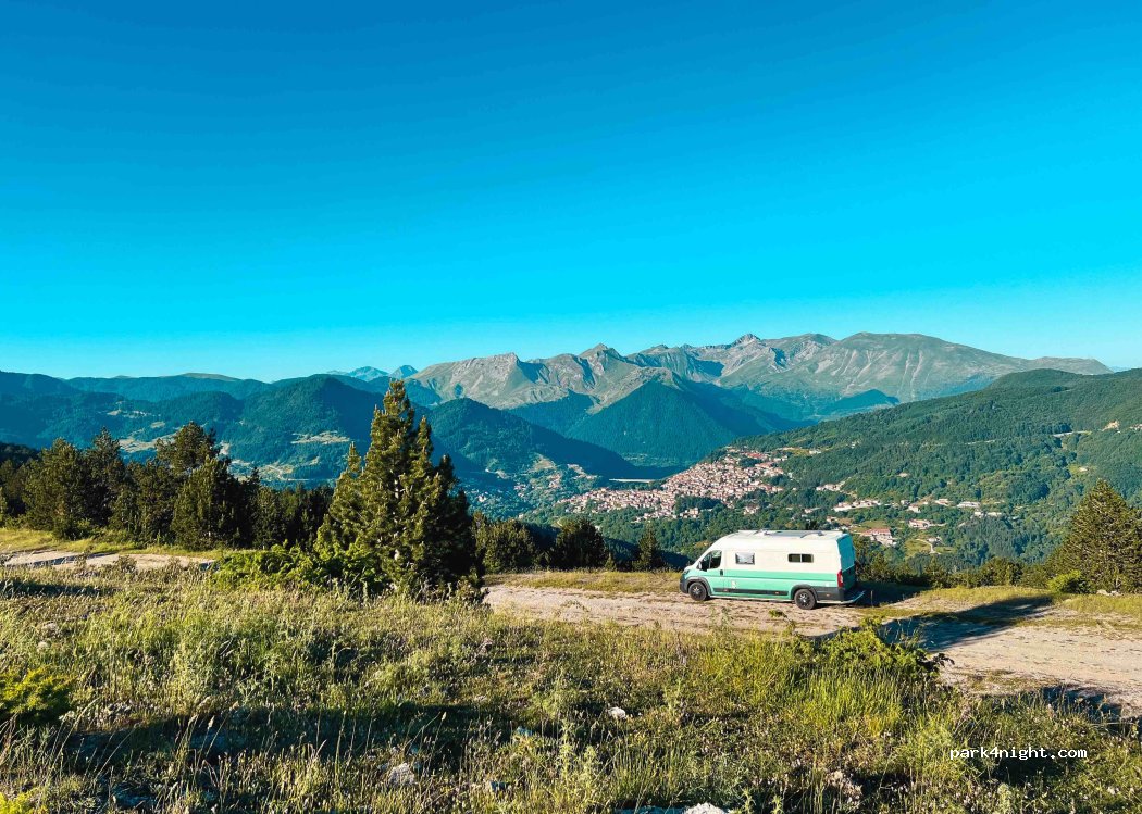 Sehr schöner Stellplatz mitten in der Natur mit Blick auf Metsovo. Leicht unterhalb der Straße hört man die paar wenigen vorbeifahrenden Autos kaum.