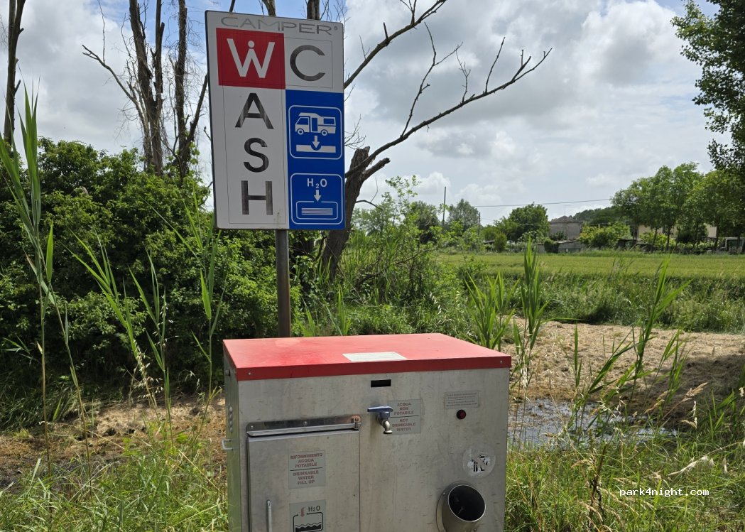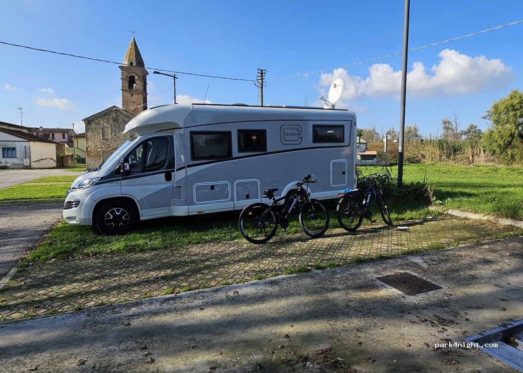 6 Sehr grosse, ruhige, ebene Stellplätze, 6 x Strom gratis - nur blaue ECC Stecker. WC entsorgen möglich. Trinkwasser war leider abgedreht. Kein WC vorhanden. Bar mit Tabacchi war geöffnet. Anfang April - keine Stechmücken. Wir kommen gerne für eine Nacht wieder. Ciao! Servus!