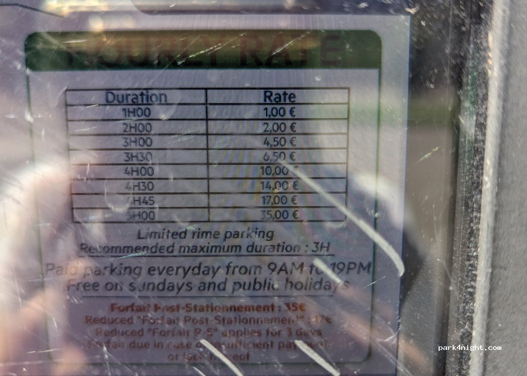 Gratuito de 19h a 9h. Ubicado al lado de los baños municipales (acceso a duchas desde 1,5€ de 9h a 17h). Aparcamos sin problema en pleno puente de diciembre y paseando fuimos al centro en unos 15’ minutos. También cerca de la iglesia de Saint-Paul.