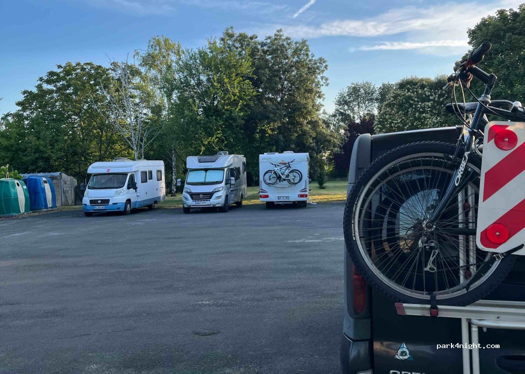 Aire sur le parking goudronné de la piscine avec un bon nombre de places. Calme, réveillés par le chant des oiseaux. Poubelles, eau et vidange.
