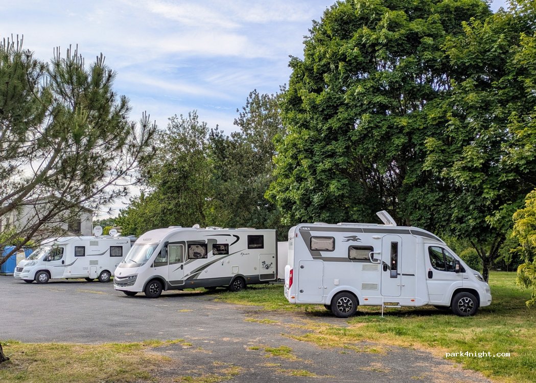 Aire pour camping-cars située sur le parking de la piscine. Aucun emplacement délimité au sol mais les camping-cars doivent se garer sur la gauche en rentrant. À droite sont réservées normalement les places pour les clients de la piscine. Sinon, personne ne dit rien mais maintenant vous le savez. Endroit très calme et arboré, mais le matin un peu réveillé par les enfants qui vont à la piscine.