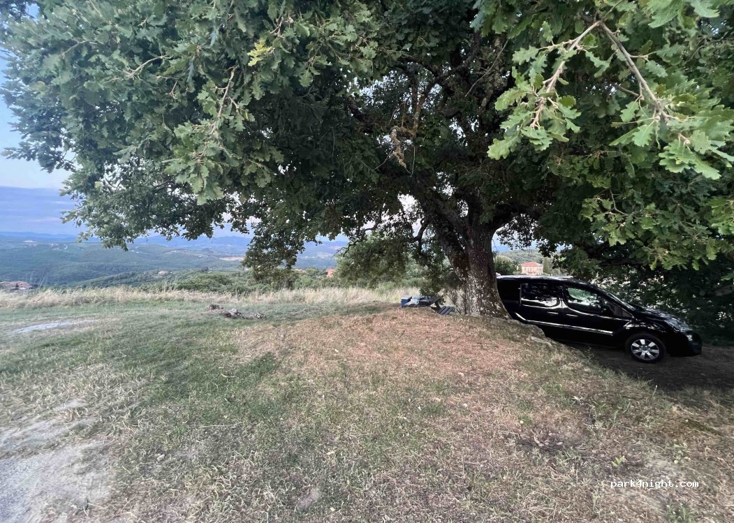 posto pianeggiante a lato quercia perfetto per in minivan.appena sopra X I camper.abbiano pernottato una notte tutto tranquillo macchine che passano fino alle 22 e ricominciano la mattina alle 6.30.vista stupenda soprattutto all'alba