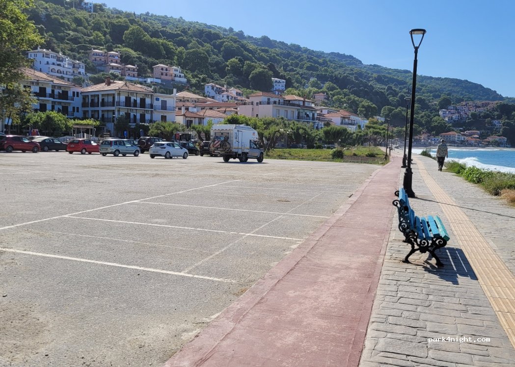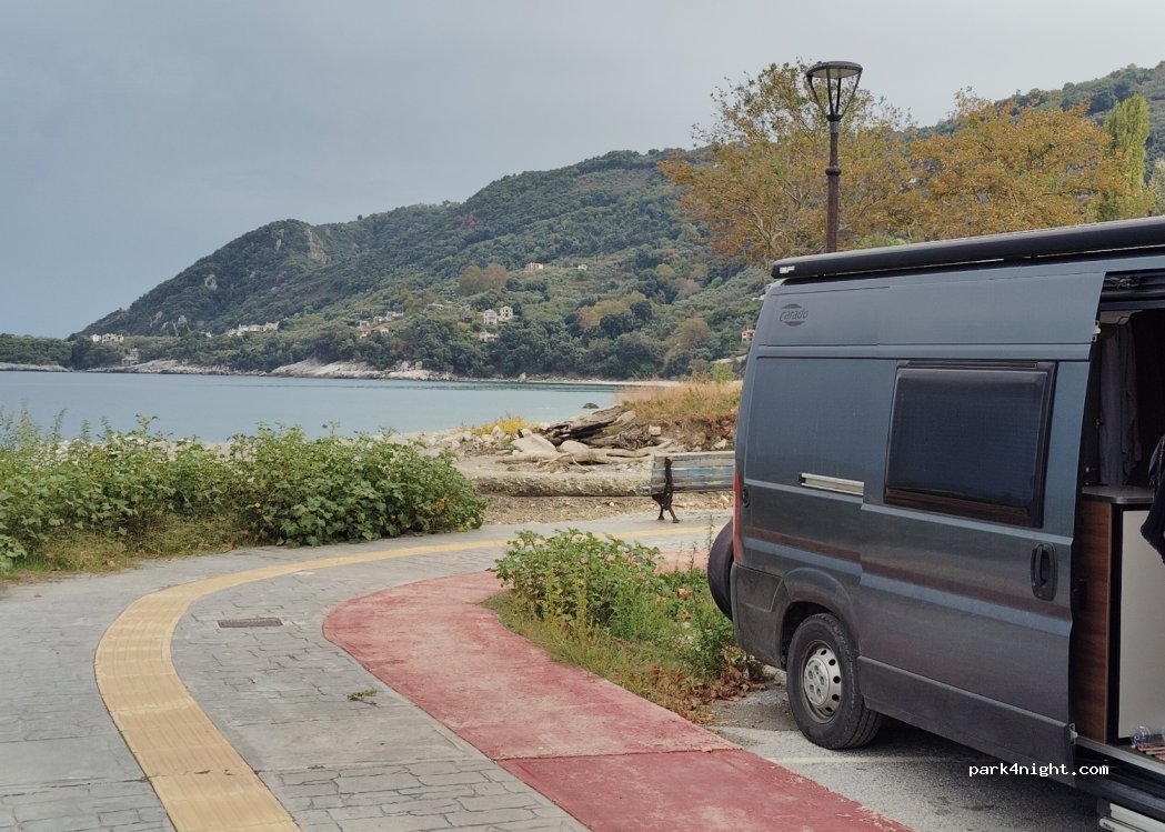 Asphaltierter Parkplatz direkt am Meer. Am Ortsausgang. Promenade geht vorne vorbei. Im Sommer ist nebenan ein Campingplatz. Wahrscheinlich dann keine Übernachtung möglich. Entlang des Strandes Wasserhähne und Duschen.