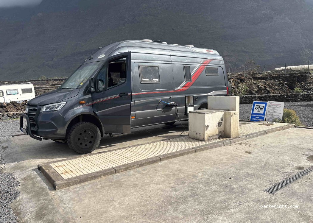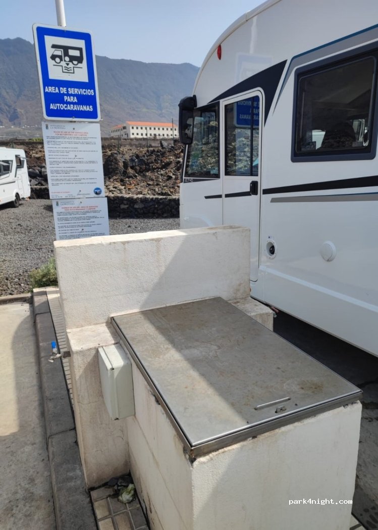 Perfecto,situado justo encima de las piscinas de las macetas con todas las instalaciones necesarias para vaciar aguas grises, negras y llenar. Se puede aparcar durante 48h.No esta permitido sacar mesas, ni toldos etc... El suelo es de picón y la entrada de cemento, para autocaravana bajas puede ser posible que rocen, la mía lo es y entre sin problema.