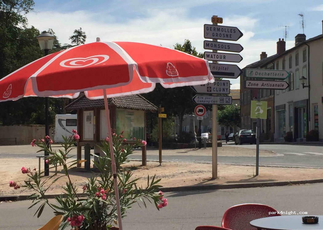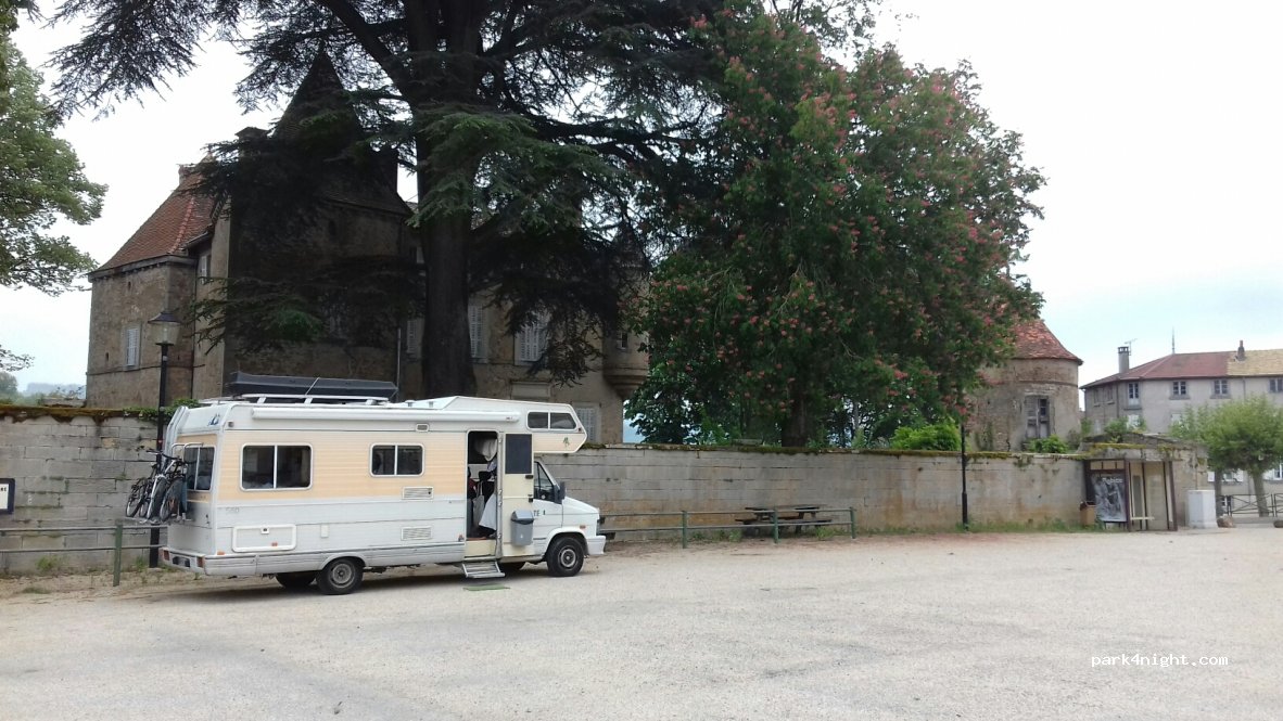 Grand parking à plat au pied du château de Tramayes. eau potable à la fontaine, commerces sur place, bel arrêt sur la route de Cluny.