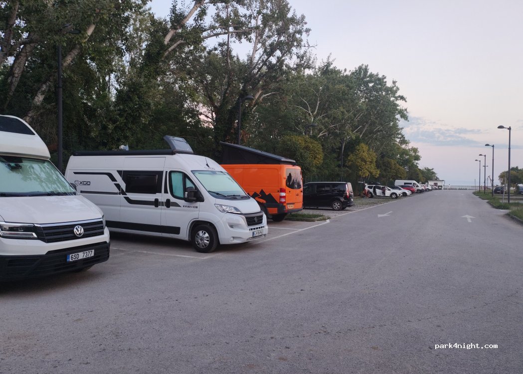 A szabdstrand nagy parkolója, hátul a sarokban van a 3 camper hely. De ez inkább 2 autónak kényelmes. Éjszaka csendes volt és védetebb a széltől.
