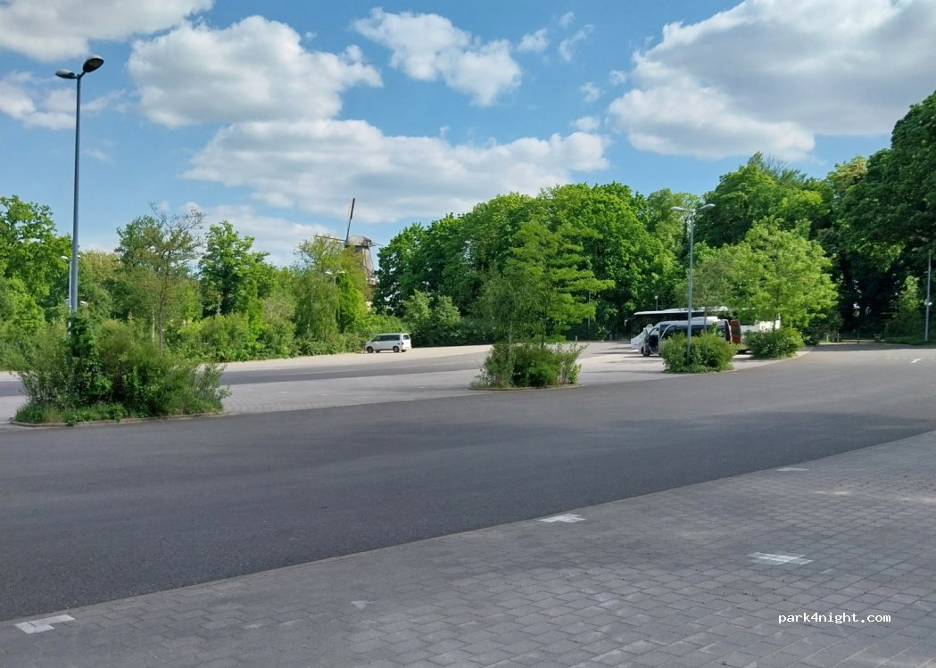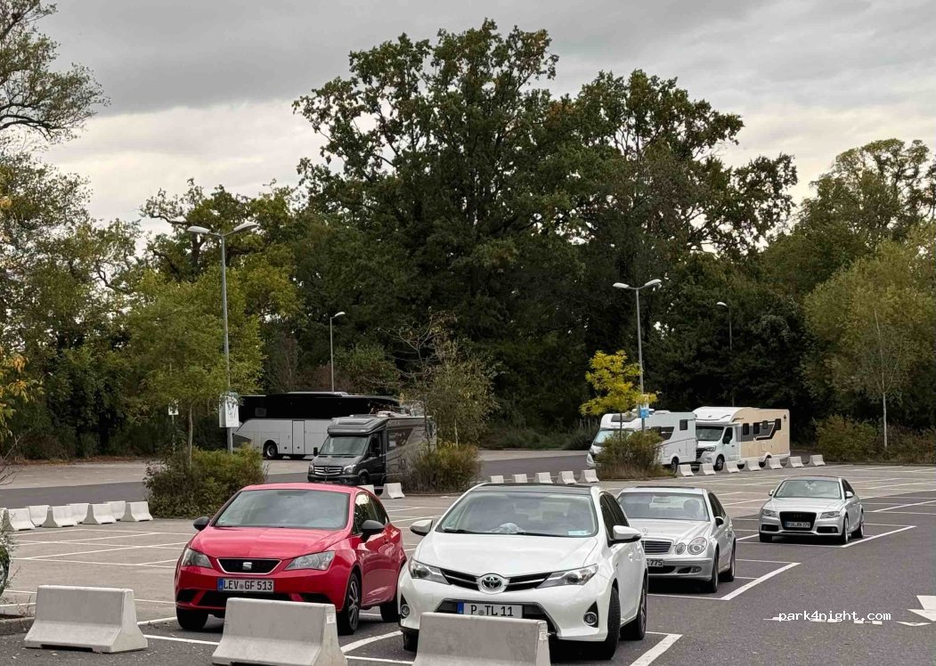 Eingezeichnete Stellplätze für Wohnmobile gegenüber den Bussen. Alle schräg, teilweise nur leicht. Insgesamt teuer da keinerlei Versorgung. Ist aber so beschrieben. Über die App bezahlen kostet 15% Gebühren, dafür gibts den Beleg per Email. Perfekt zum Besuch des Schloßes, Park und so weiter