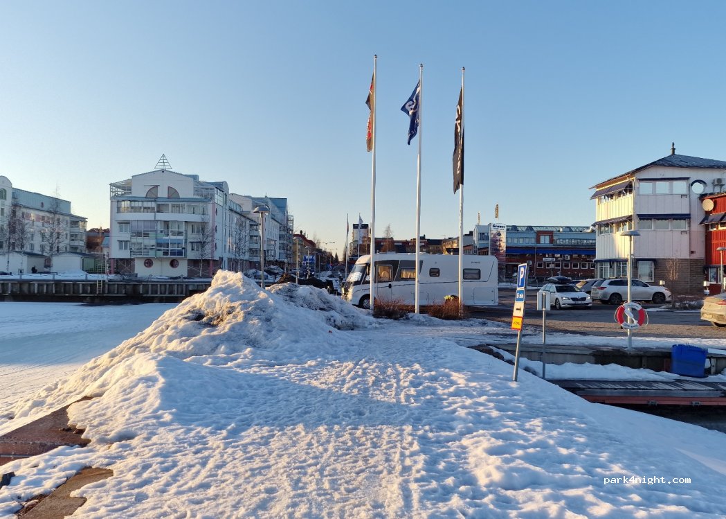 Pratique pour visiter la ville, rejoindre les pêcheurs sur la mer gelée, pas de service sauf électricité, calme la nuit, payement avec ePARK. en basse saison emplacement 220 sek avec électricité.