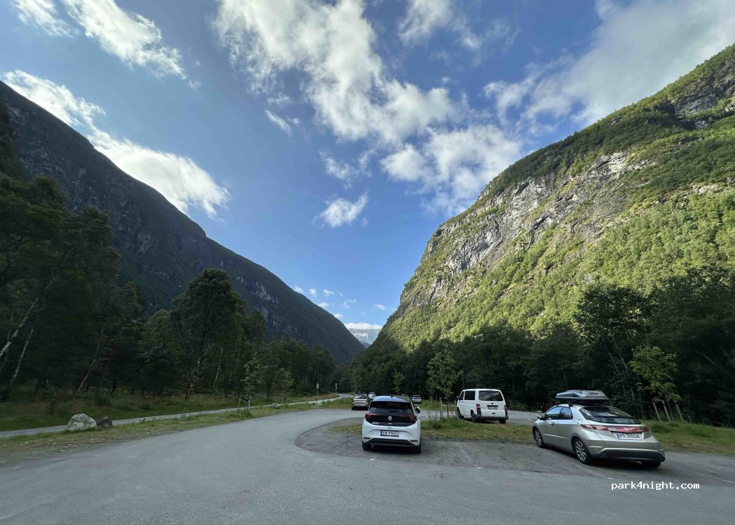 Aparcamiento gratuito, inicio de la ruta a vettifossen (dos opciones de ruta, una hasta la parte baja de la cascada y otra hasta arriba de la misma). WC muy limpios y grifo con posibilidad de llenar garrafas. prohibido pernoctar