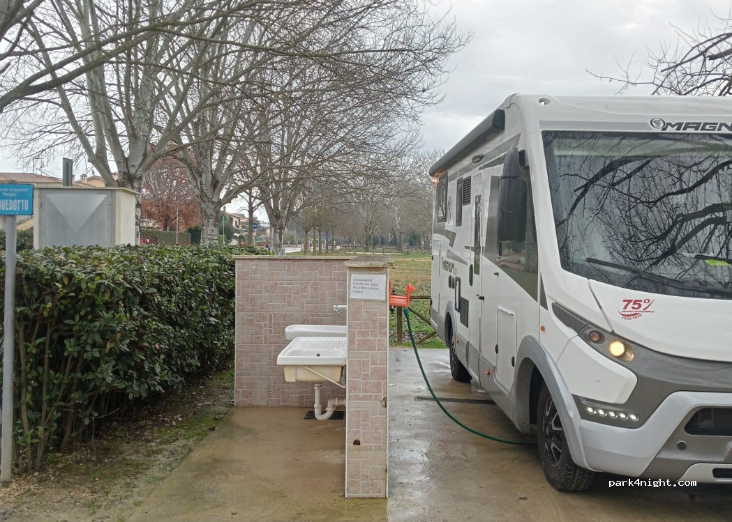 ottima area sosta per visitare castiglione del lago e per prendere il traghetto per isola maggiore e pista ciclabile....area con tutti i servizi necessari per un camperista, c'è un lavandino per i piatti e uno per il bucato, carico e scarico acqua, non é presente un wc ma per i camperisti non é necessario, molta ombra, sono presenti colonnine elettriche , 20 euro 24h