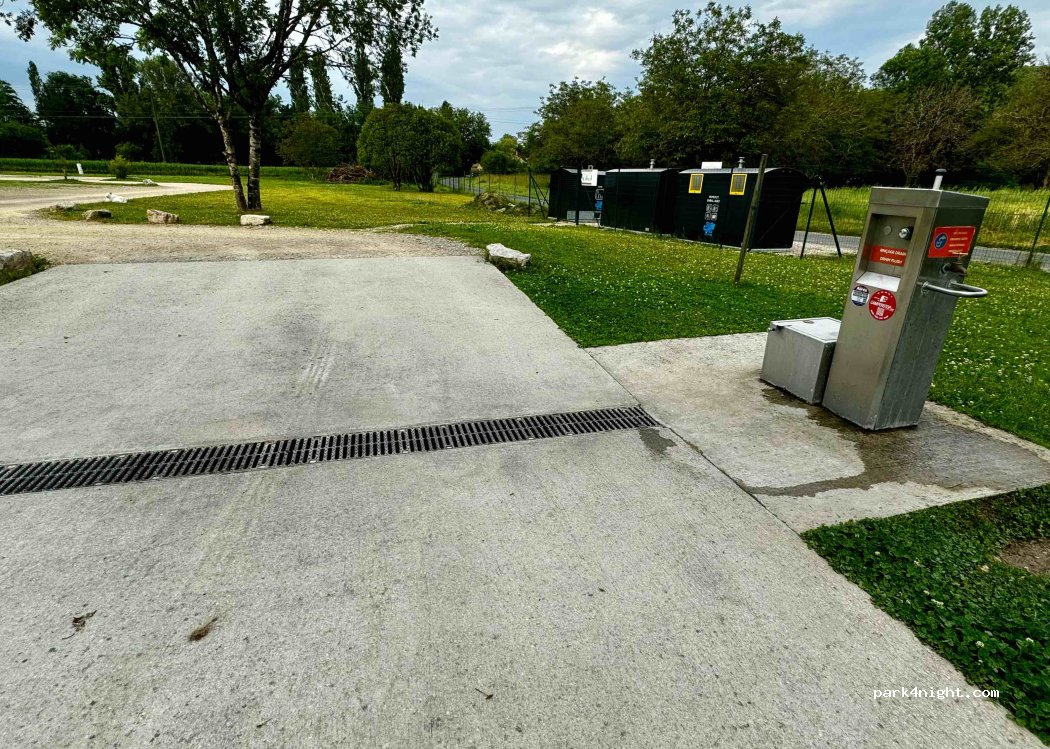 Aire super, accueil des propriétaires très aimables les emplacements sont grands avec l'électricité à tout les emplacements l'accès à la vidange est très facile même pour les grands cc, petit chemin pédestre pour allez à la ville a 800m, l'eau a volonté le tout pour 8 euros aucune critique à formuler