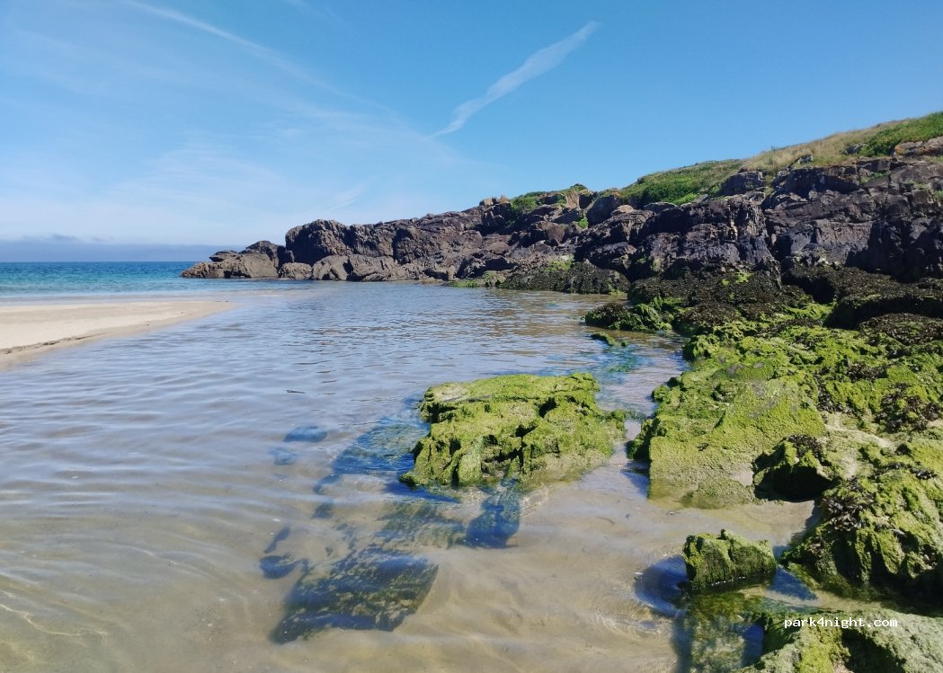 Absoluter Traumplatz, fern von Tourismus und Stadtleben. Wir waren nachts gänzlich allein und tagsüber kam nur ein oder zwei Autos, der Strand ist so gut wie leer, es ist unglaublich, eine herrliche Bucht und die kinder können sogar am flachen Fluss spielen ohne Wellen und bei Ebbe sogar rüber laufen. Die Nächte sind absolut ruhig, die Wellen kaum zu hören. Wirklich fabelhaft hier, danke.