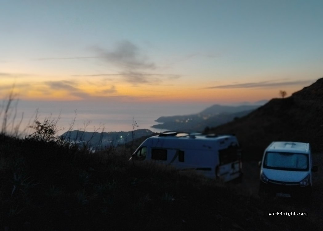 Nous nous sommes garé 200m plus bas le long de la route goudronnée et nous avions une magnifique vue sur la mer et ses côtes. Le lieu est plutôt calme, seul 2-3 voitures sont passé pendant la nuit D'autres petit bas côté sont disponible aux alentours pour se poser tranquillement