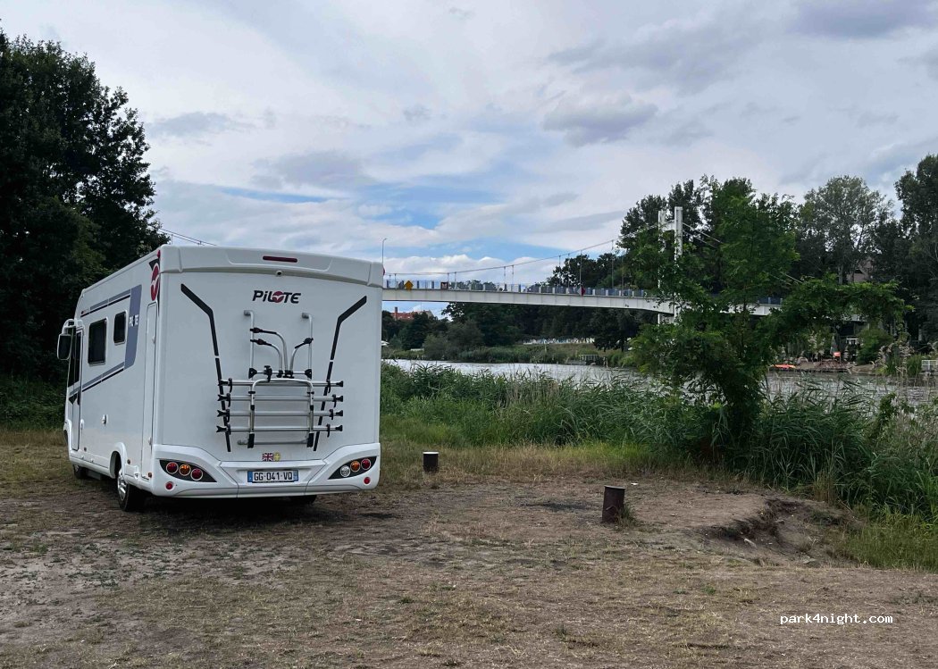 Sitio genial para aparcar y pasar el día, la ciudad, preciosa, está a 10 minutos en bici y el lugar es seguro para dejar la autocaravana. Todo perfecto siempre que no sea fin de semana, música atronadora hasta las 2 A.M.