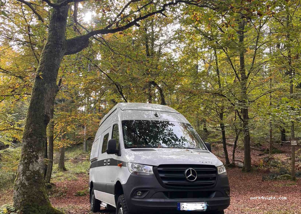 Spot en pleine nature mais à 25 mètres de la route … peu fréquentée c’est vrai. On a suivi le chemin forestier sur deux cents mètres (autorisé) et là vous êtes en pleine nature. 4x4. À plat sur le chemin. Magique.