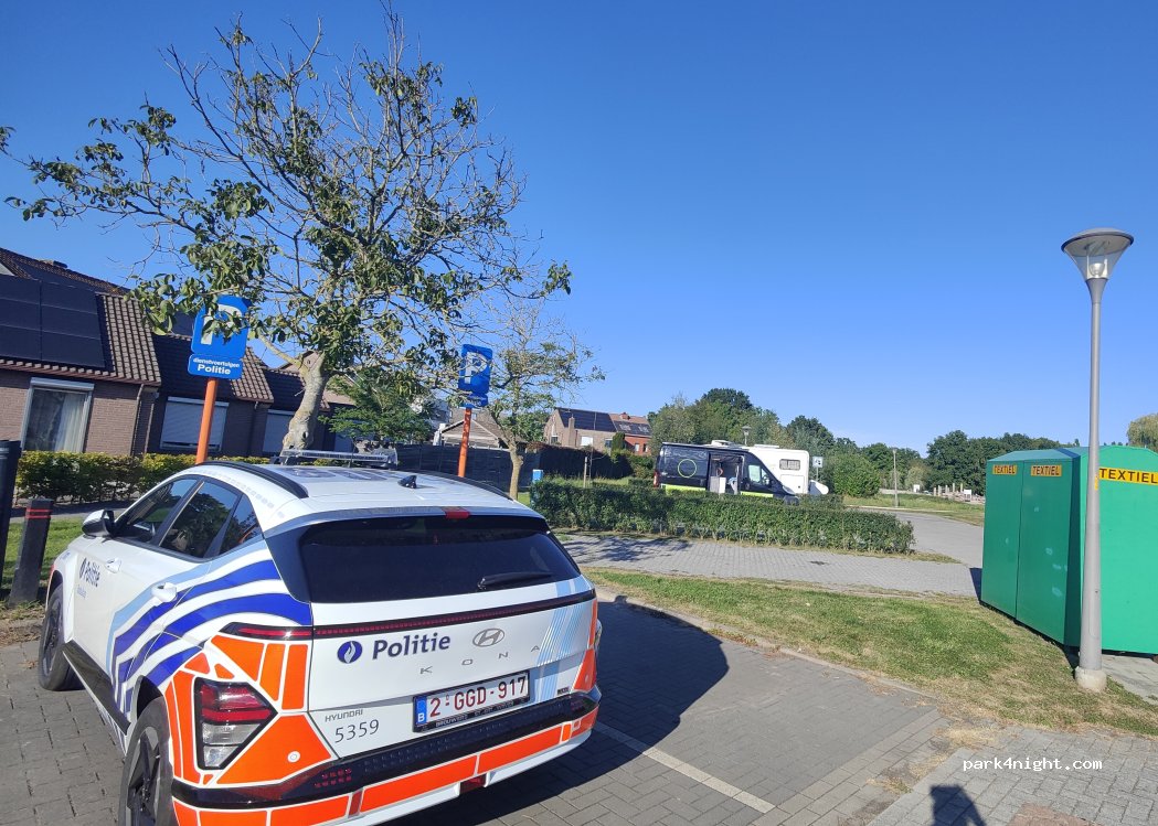 What a great stop, all you pay is for electric & water via 50c coin top up. no more than 72hrs but two have clearly overstayed. 300m walk to Aldi, 100m walk to good bus service to Mechelen (& train to Brussels) and a good few bars, restaurants and barbers in the town - 5 min walk. Hard standing - does say 3.5max but theres room for up to 9m. Waste facilities and park for children across the way.