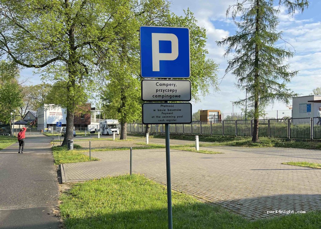 Very nice place, we stayed here for 2 nights. Very beautiful park around, lots of funny ducks around a small lake. Very nice swimming pool( just 6 zl for entrance, but there was no shower), we couldn’t visit it because of the weather. Free beach near and good playgrounds for children, also a good restaurant. At the parking we used water for free and didn’t use electricity. In the city there was a big building shop and usual shopping mall ( H&M, reserved ). It was very quiet to sleep here. In the evening the bridge is very beautifully illuminated. Definitely recommend this place !