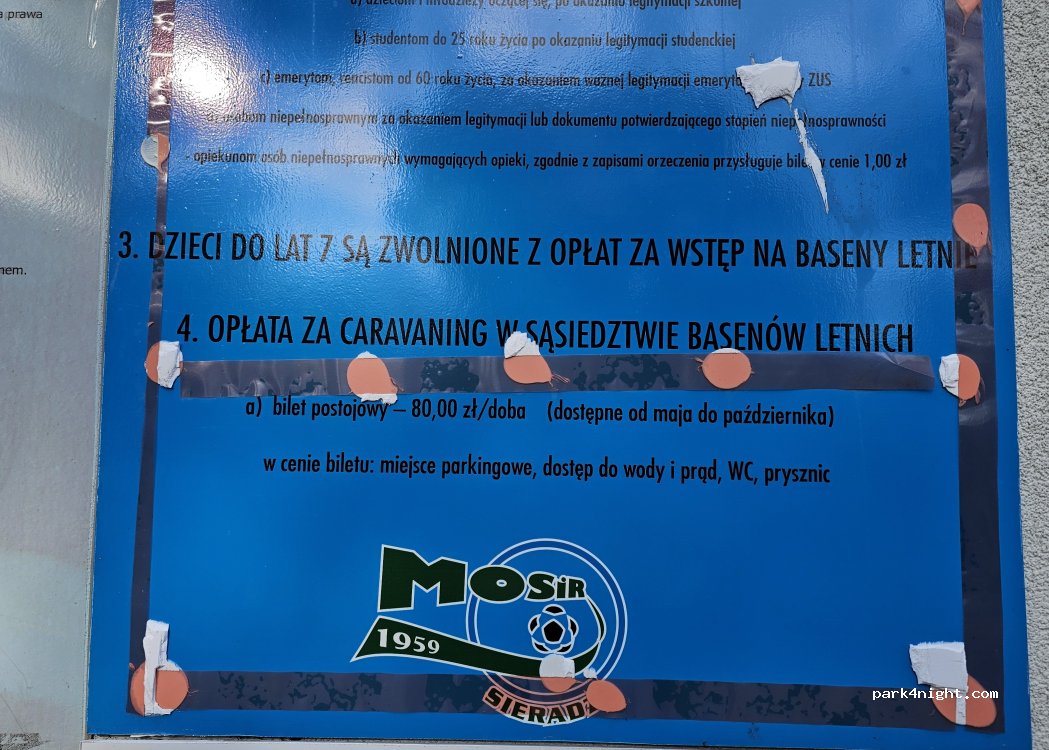 Nice camperstop in a park next to a (outdoor) swimming pool. You can use the toilet of the pool (when open) and if you ask they will show you the (hot) shower! electric and water is included for 50 zlt. (if you don't use service it's free). Felt safe, securety and police pass regularly. Quiet at night!