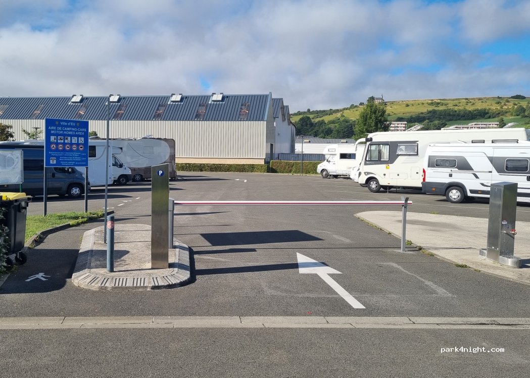 une aire bien placé pour profiter de la ville d'eu, accès facile à la mer (le Tréport et mers les bains) par le chemin verre et mer. aucun bruit la nuit, parking éclairé,électricité et eau pour 9.5€. merci a la ville