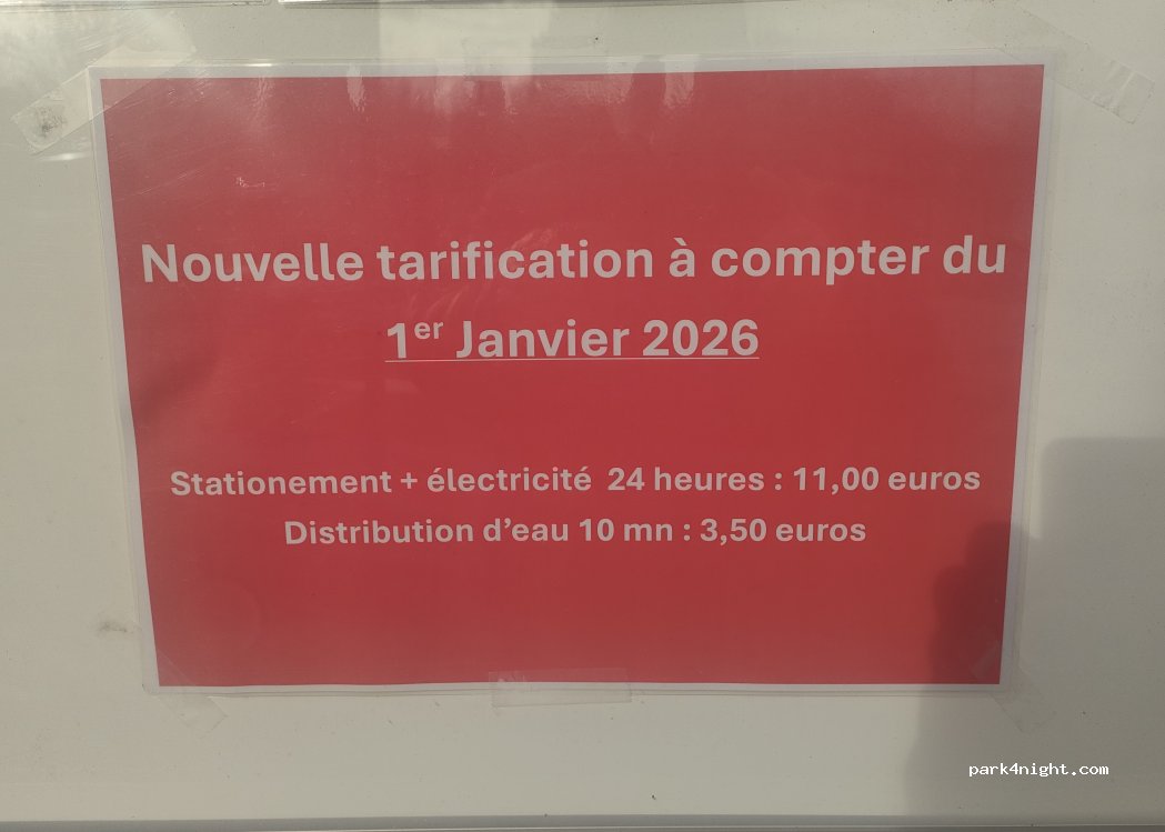 Aire propre, calme, proche de la ville. Le seul point noir, la barrière est proche de la rue, nous n’avons pas la possibilité de stationner le temps du règlement SANS GÊNER la circulation. Elle a le mérite d’exister et nous apprécions. Merci à la commune de nous accueillir.