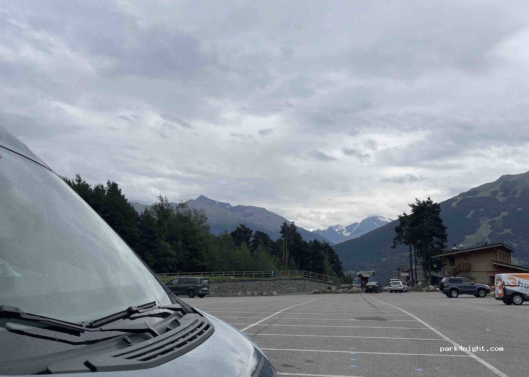 Très beau et grand parking entouré de montagnes. très calme la nuit . Aucun services. Mais c’est toujours mieux que l’aire de CC dans Bormio, enfin pour nous…Belles balades à faire à pied ou à vélo. Joli village de Bormio à visiter mais ultra touristique.